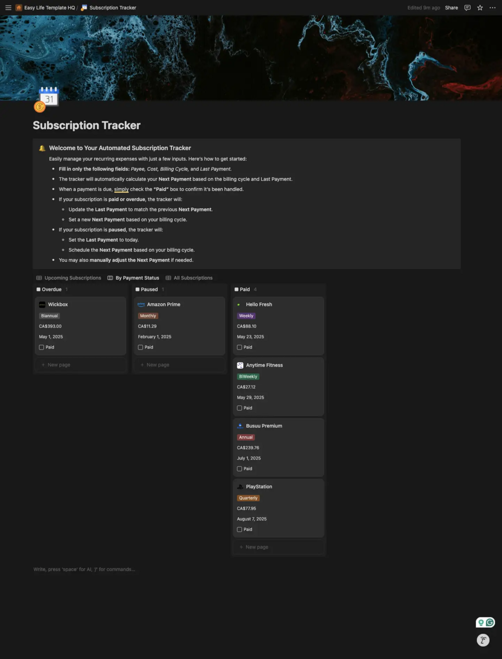 Live Payment Status: The tracker automatically updates your subscription's status to reflect whether it's Paid, Overdue, or Paused.